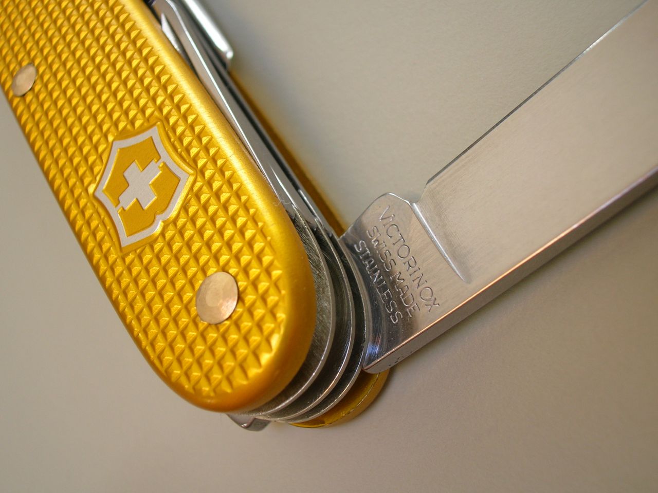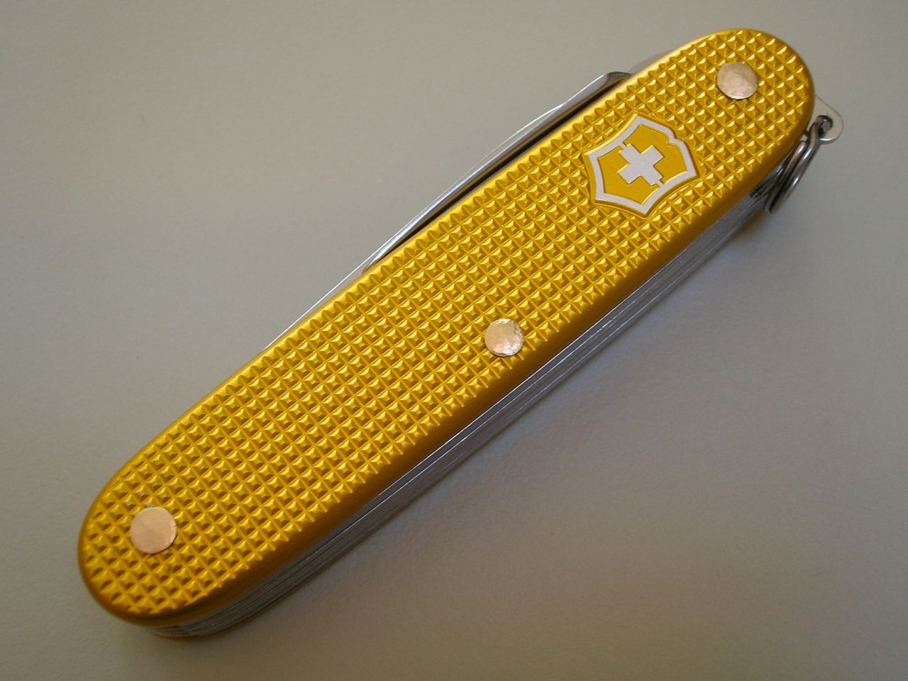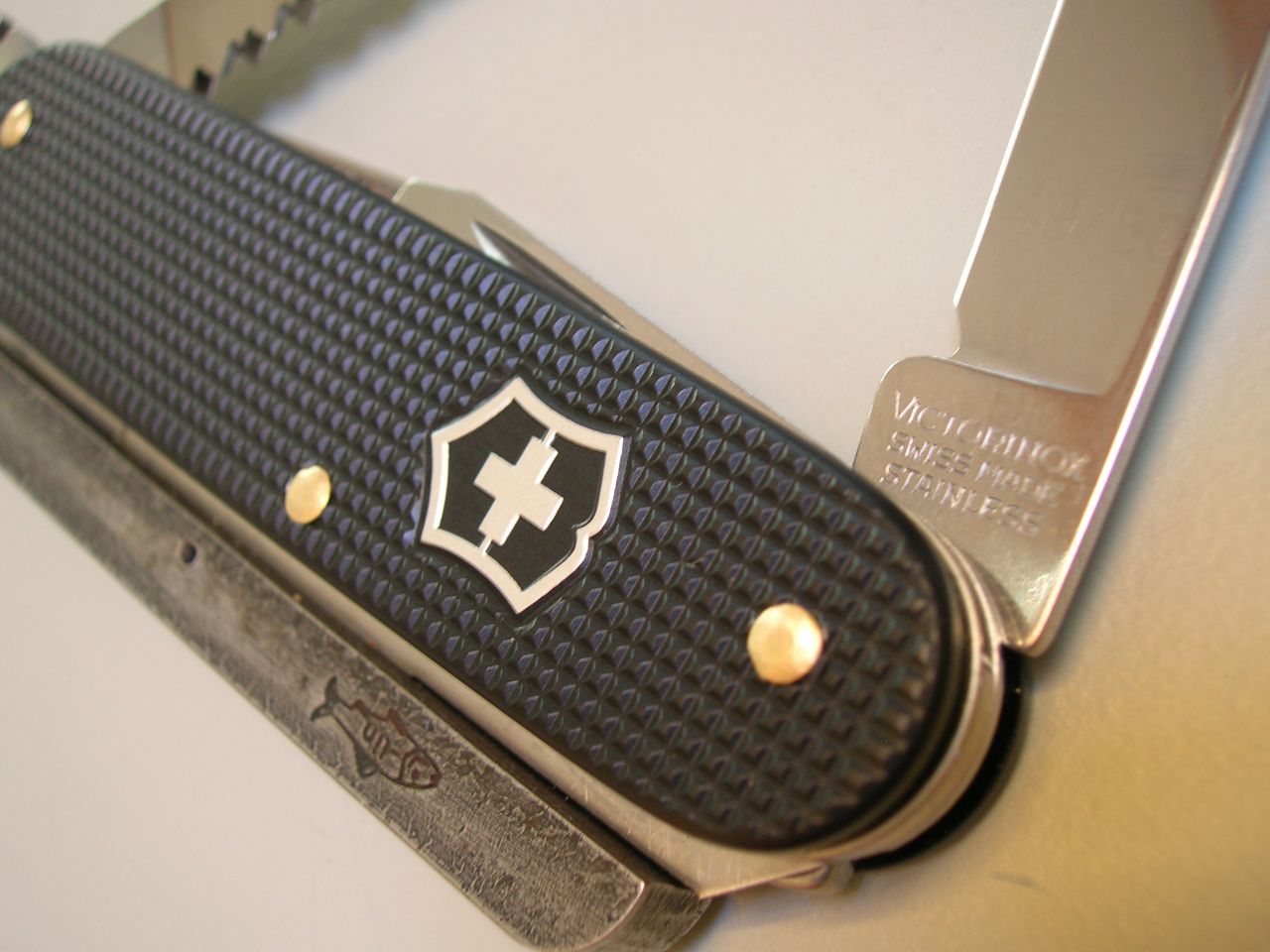 Dieses Mal ist es ein Modell Farmer, zweifarbig mit Schere und Feuerstahl auf dem Rücken. Die Frontschale ist rot mit dem silbernen Kreuz und die Rückseite bildet eine neue silbrige Schale mit dem Vic Logo.