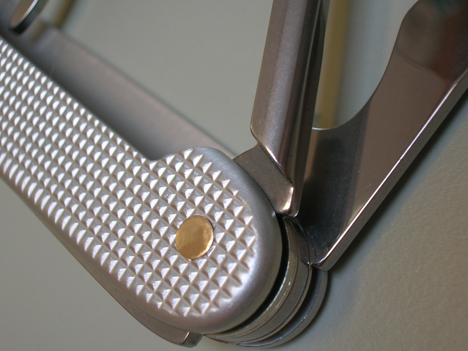 Eine Neuheit bei dieser Modifikation ist die verwendete Rückenfeder für die Schere. Diese stammt ebenfalls von einem Alox Messer. Dadurch ist der Messerrücken glatt, wie bei Alox Messern üblich. Meine früheren Modifikationen hatten alle eine kleine Lücke wegen der "falschen" Rückenfeder.