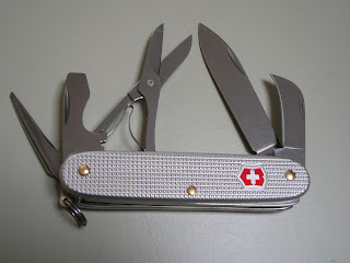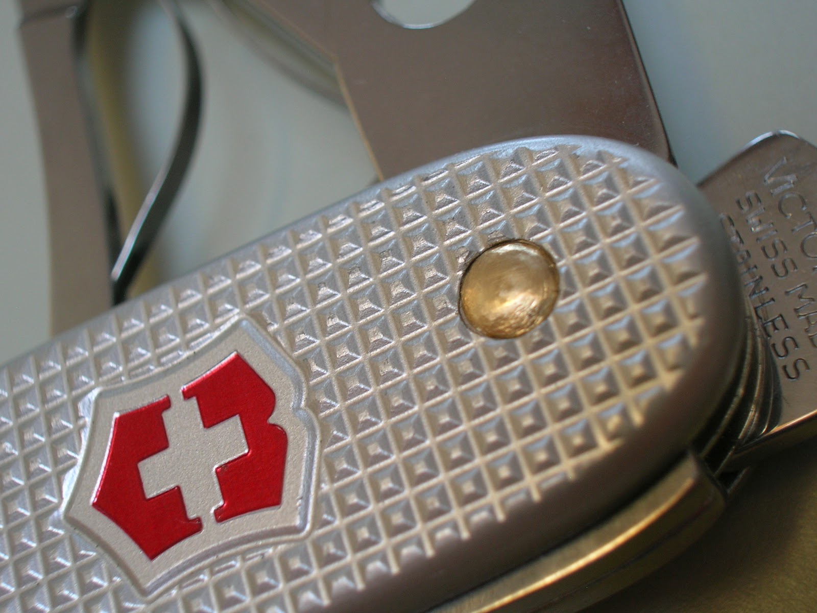 Dieses Mal ist es ein Modell Farmer, zweifarbig mit Schere und Feuerstahl auf dem Rücken. Die Frontschale ist rot mit dem silbernen Kreuz und die Rückseite bildet eine neue silbrige Schale mit dem Vic Logo.